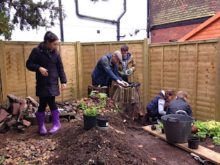 | Planting wild flowers and grass seeds and preparing the Wormery on the Sycamore stump using kitchen refuse and grass cuttings |